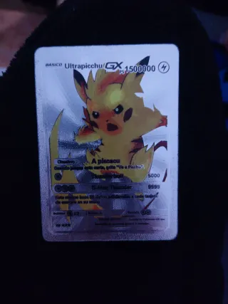Carta Pokémon plateada de Ultrapicchu GX. - Tipo Básico. - Ataque G-Max Thunder. - PS 1500000.