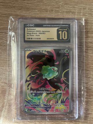 Carta de Pokémon Bulbasaur Mega Brave (064/063 AR) de la edición japonesa, con una calificación Pristine 10 de CGC. - Edición: Pokémon (2025) Japanese - Rareza: Art Rare - Holo - Calificación: Pristine 10 por CGC - Número de serie: 6094394010