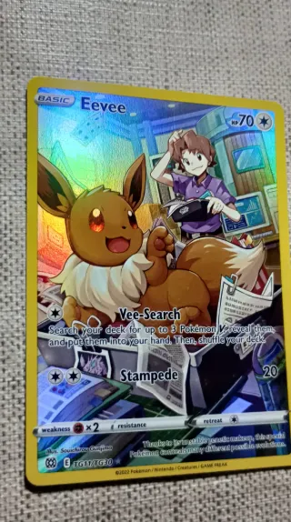 Carta Pokémon de Eevee, edición básica. - Ataque Vee-Search para buscar hasta 3 Pokémon V. - Habilidad Stampede. - Ilustración de Souichirou Gunjima. - Código TG11/TG30.
