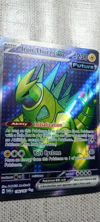 Carta Pokémon original de Iron Thorns EX. - Número de carta: 196/167 - Habilidad: Initialization - Ataque: Volt Cyclone - Ilustrador: PLANETA Mochizuki - Tipo: Future