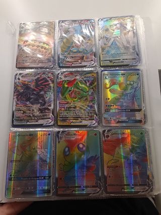 Colección de cartas Pokémon, incluyendo varias cartas GX, V y VMAX. - Solgaleo GX - White Kyurem - Lunala - Chartarix - Varias cartas con arte especial y foil.