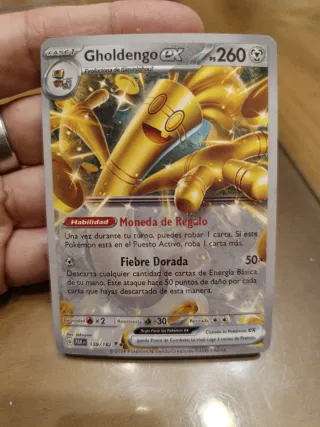 Carta Pokémon Gholdengo EX. - Fase 1. - Evoluciona de Gimmighoul. - Habilidad: Moneda de Regalo. - Ataque: Fiebre Dorada. - Debilidad x2. - Resistencia -30. - Retirada: 2. - Ilustrador: takuyoo. - Número de carta: 139/182. - Año: 2024.