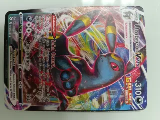 Carta Pokémon de Umbreon VMAX. - Habilidad: Señal Oscura. - Ataque: Maxisombra. - PS: 310. - Debilidad: x2. - Resistencia: - Regla VMAX: Cuando tu Pokémon VMAX queda Fuera de Combate, tu rival coge 3 cartas de Premio. - Ilustrador: Akira Egawa. - Año: 2021.