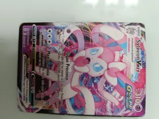 Carta Pokémon de Sylveon VMAX. - Ilustración de Ryota Murayama. - Ataque Maxiarmonía con daño base 70+. - Habilidad Toque Precioso que cura 120 puntos de daño. - Debilidad x2. - Resistencia. - Regla VMAX.