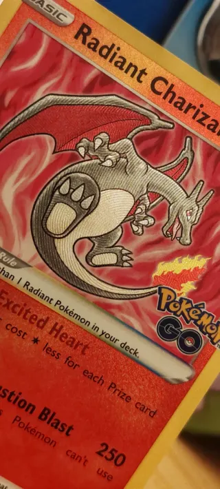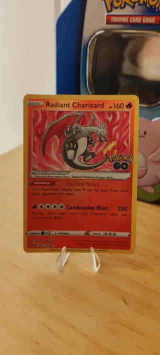 Carta Pokémon de Radiant Charizard, número 011/078. - Tipo: Básico - HP: 160 - Habilidad: Excited Heart - Ataque: Combustion Blast - Debilidad: x2 - Resistencia - Retirada: ***