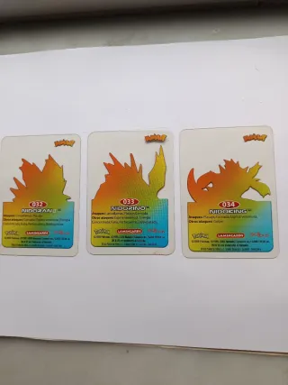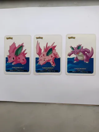 Lote de 3 cartas de Pokémon, de la marca Lamincards tienen algún desperfecto por el paso de los años. - Carta de Nidoran macho. - Carta de Nidorino. - Carta de Nidoking. Se aceptan ofertas también por cartas individuales pero cada tiene su precio dependiendo del Pokémon y del estado en el que esté, y también se pueden hacer lotes con las otras cartas.