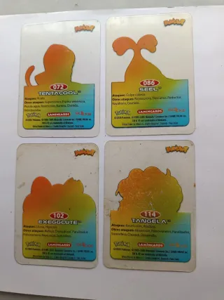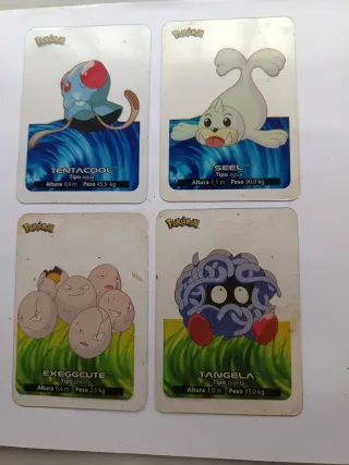 Lote de 4 cartas de Pokémon, de la marca Lamincards tienen algún desperfecto por el paso de los años. - Carta de Tentacool. - Carta de Seel. - Carta de Exeggcute. - Carta de Tangela. Se aceptan ofertas también por cartas individuales pero cada tiene su precio dependiendo del Pokémon y del estado en el que esté, y también se pueden hacer lotes con las otras cartas.