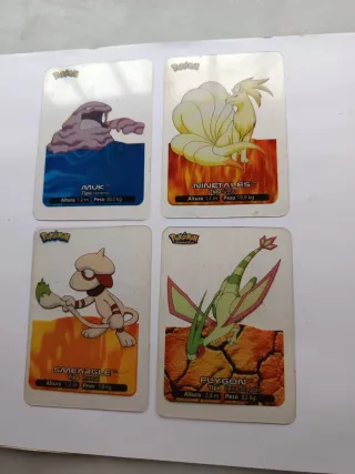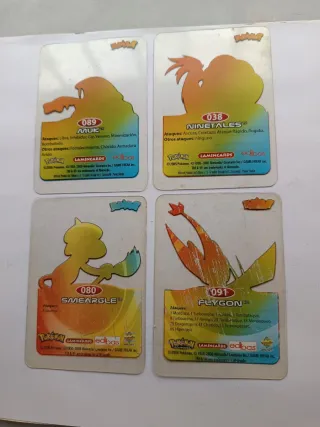Lote de 4 cartas de Pokémon, de la marca Lamincards tienen algún desperfecto por el paso de los años. - Carta de Muk. - Carta de Ninetales. - Carta de Smeargle. - Carta de Flygon. Se aceptan ofertas también por cartas individuales pero cada tiene su precio dependiendo del Pokémon y del estado en el que esté, y también se pueden hacer lotes con las otras cartas.