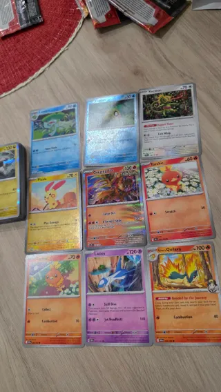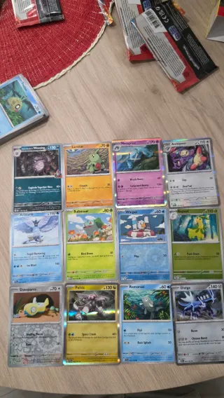 Lote de cartas Pokémon de la colección Prismatic Evolutions. Incluye varias cartas de diferentes Pokémon. Aprox 65 (creo que 67 si no conté mal) Algunas holo y reverse Van algunás repetidas