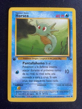 Carta Pokémon de Horsea, número 49/62 de la expansión Fossil. Es una carta de Primera Edición. - Pokémon Básico: Horsea - Ataque: Pantallahumo - Coste de retirada: 10 - Debilidad: Rayo - Ilustrador: Mitsuhiro Arita - Año: 1995, 96, 98 Nintendo, Creatures, GAMEFREAK. ©1999-2000 Wizards.