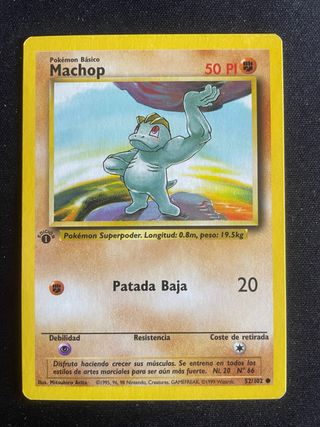 Carta Pokémon de Machop, número 52/102, de la primera edición del Set Base. - Pokémon Básico: Machop - Ataque: Patada Baja - Coste de retirada: 1 - Ilustrador: Mitsuhiro Arita - Año: 1995, 96, 98 Nintendo, Creatures, GAMEFREAK ©1999 Wizards.