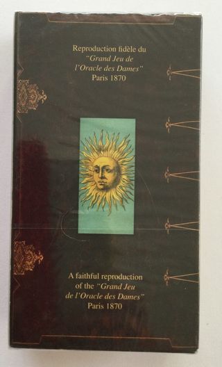 Reproducción fiel del “Grand Jeu de l’Oracle des Dames”, Paris 1870 Etteilla sostuvo que el juego del Tarot era el legendario Libro de Thoth, un texto mágico que se remonta al antiguo Egipto relacionado con Thoth el dios egipcio de la sabiduría y la magia. Según el cartomante este libro fue creado en el año 2170 a.C. y por ello quiso devolverles su aspecto original. Hacía 1789 mandó diseñar una baraja que tituló “Libro de Toth” o el gran juego de 78 cartas del Tarot egipcio. De esa obra sólo quedó un puñado de cartas, pero en 1804 se volvió a imprimir una versión completa que se reproduce aquí. Procedente de mi colección nuevo