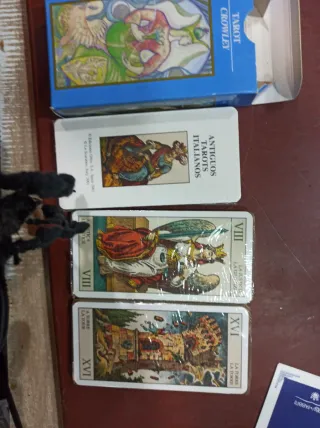 Se venden tres barajas de tarot. - Una baraja de Tarot Crowley. - Una baraja de Antiguos Tarots Italianos. - Una baraja con las cartas VIII (La Justicia) y XVI (La Torre) visibles.