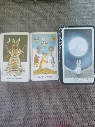 Baraja de tarot Lunalapin con temática de conejos. - Incluye la caja metálica. - Las cartas muestran ilustraciones de conejos en escenas de tarot. - Se incluyen las cartas Two of Swords y Seven of Cups.