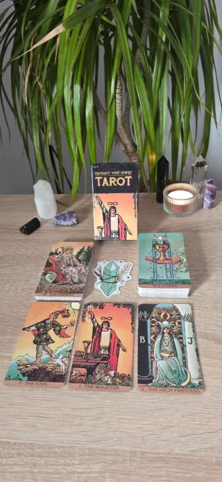 Baraja de tarot Radiant Wise Spirit. Edición mini. - Incluye la caja original. - Contiene cartas como El Mago, La Sacerdotisa, La Rueda de la Fortuna y El Loco.