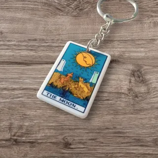 Llavero con diseño de la carta del tarot 'La Luna' y, por detrás tiene el dibujo de carta, como se puede ver en las fotos. - Es de acrílico. - Diseño inspirado en la carta del tarot. - Incluye anilla para llaves. - Las medidas se pueden ver en las fotos. - Es nuevo y se entrega en sobre de papel de regalo.