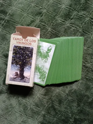 Baraja de cartas del Tarot de los Vikingos. - Ilustraciones inspiradas en la mitología nórdica. - Diseño con un árbol central y figuras. - Caja con texto TAROT DE LOS VIKINGOS.