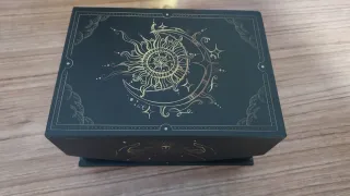 Elegante caja diseñada para guardar tus cartas de tarot. Presenta un llamativo diseño en dorado sobre fondo oscuro. - Ilustración de sol y luna en la tapa. - Detalles ornamentales en los bordes. - Diseño de manos y sol en el frontal.