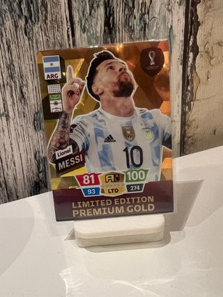 Carta de edición limitada de Lionel Messi. Panini - Edición Premium Gold. - Incluye estadísticas de juego: 81, 93, LTD, 100, 274. - Representa a Argentina (ARG). Inversion