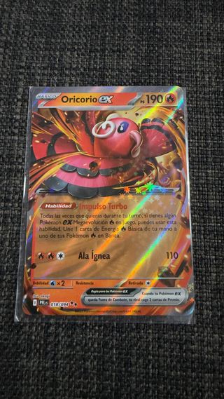 Carta Pokémon de Oricorio EX con 190 PS. - Habilidad: Impulso Turbo. - Ataque: Ala Ignea. - Debilidad: x2. - Resistencia. - Retirada. - Regla para los Pokémon EX: Cuando tu Pokémon EX queda Fuera de Combate, tu rival coge 2 cartas de Premio. - Código: PFLB 018/094.
