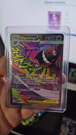 Carta de Pokémon Mega Gengar EX. Se envia tal cual está más protección. No negociable. - Habilidad: Ocultación Sombría. - Ataque: Vendaval Vacuo (230). - Debilidad: x2. - Resistencia. - Ilustrador: Taiga Kasai. - Número de carta: 269/217.