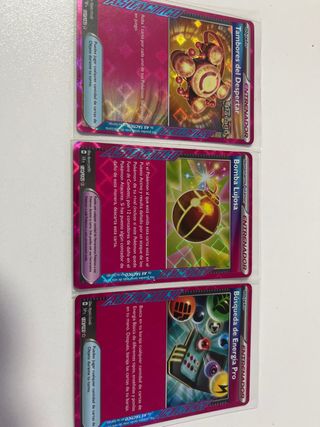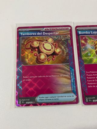 Conjunto de tres cartas de Entrenador Pokémon. - 100% Originales. - Cartas raras. - Tambores del Despertar (Objeto) - Bomba Lujosa (Herramienta Pokémon) - Búsqueda de Energía Pro (Objeto)