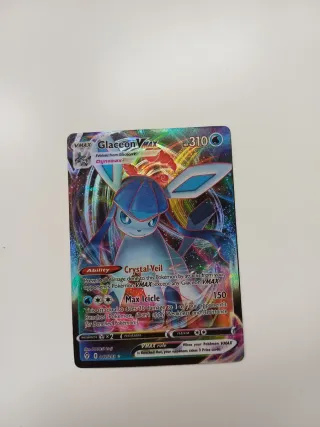 Carta Pokémon de Glaceon VMAX. - Habilidad: Velo de Cristal. - Ataque: Maxitémpano. - HP: 310. - Debilidad: Fuego x2. - Resistencia: Planta -30. - Coste de Retirada: 2.
