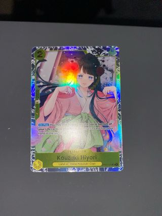 Carta de Kouzuki Hiyori de One Piece, edición SR OP06. - Personaje: Kouzuki Hiyori. - Clan: Land of Wano/Kouzuki Clan. - Coste: 2. - Poder: 0. - Contra: +2000. - Habilidad: On Play, puedes añadir 1 carta de la parte superior o inferior de tus cartas de Vida a tu mano. Añade hasta 1 carta de tu mano a la parte superior de tus cartas de Vida. - Fabricada en Japón.