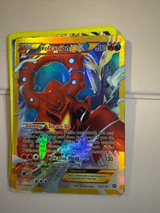 Carta Pokémon de Volcanion EX, número 115/114. - Habilidad: Steam Up. - Ataque: Volcanic Heat (130 de daño). - Debilidad: x2. - Resistencia: -20. - Regla Pokémon-EX: El oponente toma 2 cartas de Premio si este Pokémon es Derrotado. - Ilustrador: Mitsuhiro Arita.