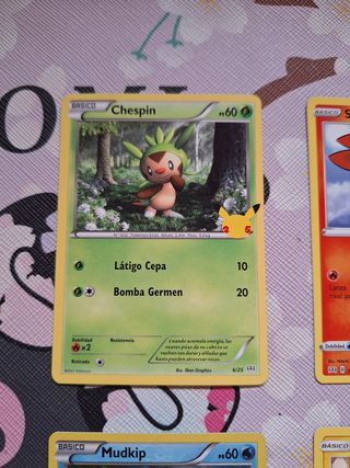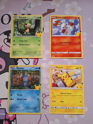 Juego de cuatro cartas Pokémon de la promoción de 2021. Las cartas están en buen estado y cuestan 3€ CADA UNA - Incluye a Chespin (6/25), Scorbunny (16/25), Mudkip (19/25) y Pikachu (25/25). - Cartas básicas, la de Mudkip es la única que brilla. - Productos 100% coleccionables. HAN ESTADO SIEMPRE EN FUNDA GAME FREAK