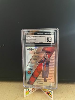 Carta coleccionable de fútbol DAKA 2022-23 de Ronaldinho, certificada por CGC con una calificación de 8.5. - Modelo: Barcelona Holocene - Récord IFFHS - Grado: NM/MINT+ - Número de serie: 1036084018 #cromosdefurbol#coleccionismo#barcelona#leyendas#cartasgradeadas