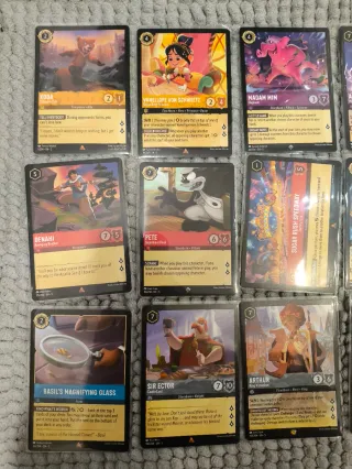 Colección de cartas del juego Lorcana, expansión Shimmering Skies. Incluye varias cartas de personajes y acciones. - Koda - Vanellope Von Schweetz - Madam Mim - Anna - Rafiki - Iago - Denahi - Pete - Sugar Rush Speedway - The Queen - Kuzco - Royal Tantrum - Basil's Magnifying Glass - Sir Ector - Arthur - Plate Armor - Bad-Anon #lorcana