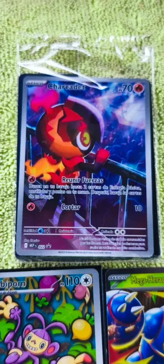 Lote de tres cartas Pokémon. Charcadet aún en su precinto de fuegos fantasmales El precio es por las 3 cartas,siempre en funda También envios ordinarios