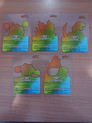 Colección lamincards de cartas Pokémon. - Carta de Koffing, tipo veneno, altura 0,6 m, peso 1,0 kg. - Carta de Nidoran ♂, tipo veneno, altura 0,5 m, peso 9,0 kg. - Carta de Ekans, tipo veneno, altura 2,0 m, peso 6,9 kg. - Carta de Poliwrath, tipo aqua, altura 1,3 m, peso 54,0 kg. - Carta de Dewgong, tipo aqua, altura 1,7 m, peso 120,0 kg.