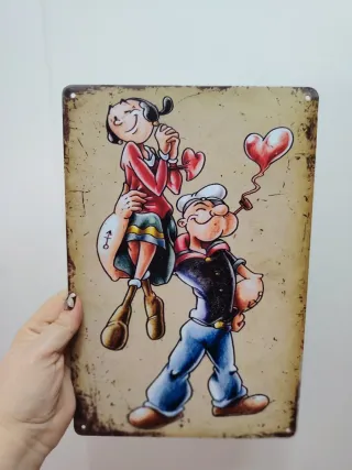 NO REALIZO ENVÍOS POR VALOR INFERIOR A 5 EUROS Cartel decorativo de metal con los personajes de Popeye y Olivia. - Medidas: 30 x 20 cm. - Diseño vintage con borde desgastado.