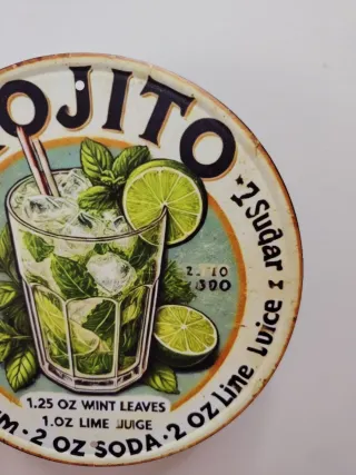 NO REALIZO ENVÍOS POR VALOR INFERIOR A 5 EUROS Cartel redondo de metal con diseño de Mojito. Ideal para decorar bares o cocinas. - Diámetro: 20 cm. - Diseño vintage de cóctel. - Texto: MOJITO y receta.