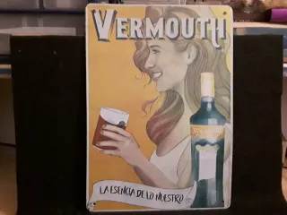 Cartel metálico vintage de Martini Vermouth, con diseño de Riccobaldi. Presenta una ilustración icónica de la marca. - Diseño gráfico de Riccobaldi. - Texto MARTINI VERMOUTH EXÍJALO SIEMPRE BIEN HELADO.