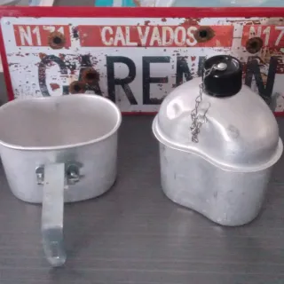 Conjunto de cantimplora y taza de aluminio, estilo militar. Similar al americano de la segunda guerra y posterior. Ver en la cuarta foto la similitud con una original. - Cantimplora con tapa y cadena. - Taza con asa abatible. Han preguntado por el cartel de Carenan,..El cartel no va incluido , pero se puede vender por otros 20.