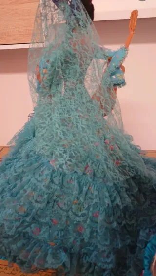 Muñeca Marin Chiclana Cartel de Abril serie 0, 45 cm vestida de flamenca celeste con flores y con guitarra. Una muñeca de las más buscadas, en un estado de conservación increíble, parece nueva, lleva su peana original, pololos y zapatitos blancos, una delicia de artesanías española de la época dorada peninsular. Si eres amante de éstas preciosas muñecas, ya sabes que es para ti. ÚNICA EN WALLAPOP - Vestido azul con flores. - Velo de encaje. - Guitarra dorada.