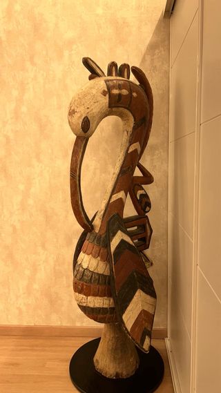 SE VENDE ESCULTURA conocida como “ A-Bamp” La escultura es una figura de pájaro Baga a-Bamp, también conocida como cálao o garceta, originaria de Guinea, África Occidental. Estas tallas de madera pintada tienen un significado cultural y ritual importante. Detalles de la Escultura Origen Tribal: Pueblo Baga de Guinea. Uso Ritual: Estas figuras a-Bamp suelen ser tocados (máscaras de cresta) usados durante las mascaradas rituales de iniciación de los adolescentes. Simbolismo: La escultura está asociada con el pájaro primordial de la cosmogonía Senufo (un pueblo vecino con simbolismo similar) y a menudo se interpreta el pico largo