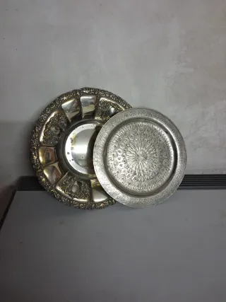 Conjunto de dos bandejas antiguas con un diseño intrincado y detalles ornamentales. - Bandeja principal con borde labrado y relieve. - Bandeja secundaria con grabado central de estilo geométrico. Las 2 se venden juntas por 6 euros