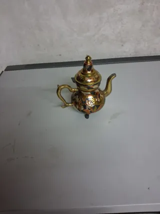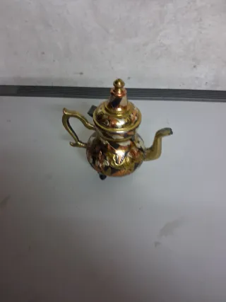 Tetera antigua con un diseño intrincado y detalles metálicos. - Materiales metálicos con acabados en dorado, cobre y negro. - Decoración floral y geométrica. - Forma tradicional de tetera con asa y pico.