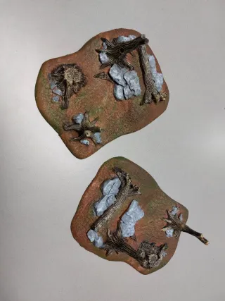 Dos bases de escenografía temáticas de bosque, ideales para juegos de miniaturas. - Bases con árboles secos y rocas. - Diseños variados para crear escenarios. - Pintadas a mano con detalle. Medidas 14 x 10 x 6,5 cm Warhammer fantasy aos age of sigmar escenografía escenografia rol d&d dungeons and dragons
