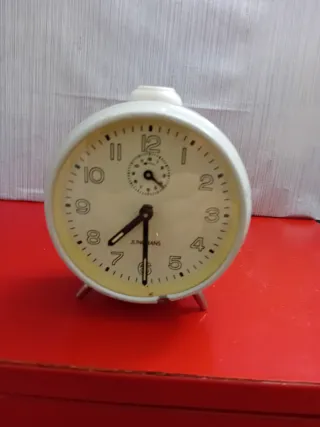 Reloj despertador clásico de la marca JUNGHANS. - Color blanco. - Diseño vintage. - Esfera con números y manecillas.
