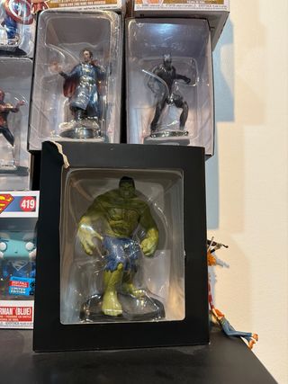 Colección de figuras de coleccionista de Marvel y DC Comics. - Figura Funko Pop! de Deadpool (400). - Figura Funko Pop! de Superman (Blue) (419), edición limitada de convención. - Figuras de acción de Thor, Capitán América, Iron Man, Spider-Man y Doctor Strange.