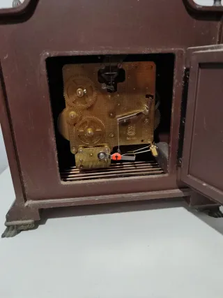 Elegante reloj de sobremesa de los hermanos Hermle para coleccionistas. - Esfera con números romanos y detalles dorados. - Indicador de fase lunar. - Asa superior para transporte. -Melodía agradable. -Pesa que te cagas 😂