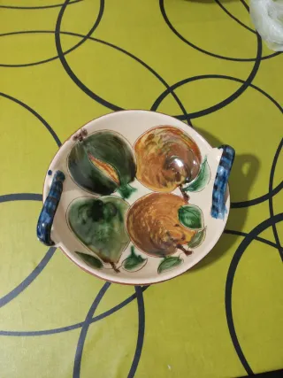 Bonito frutero o centro de mesa de cerámica, con un diseño pintado a mano de frutas. - Pieza de cerámica. - Diseño de frutas pintadas. - Asas laterales.