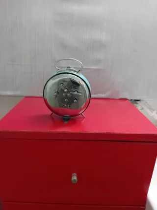 Reloj despertador de estilo clásico con doble campana y acabado metálico brillante. Su diseño retro lo hace un objeto decorativo además de funcional. - Esfera con números grandes para fácil lectura. - Agujas de hora, minuto y segundero. - Asa superior para transporte.No funciona necesita reparacion.