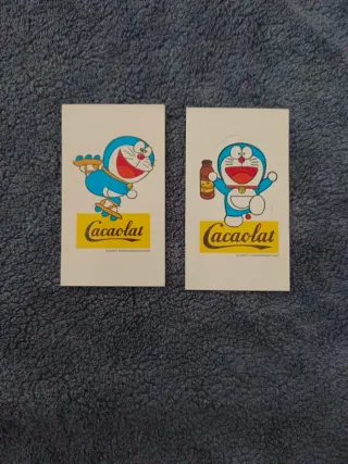 Dos pegatinas coleccionables del personaje Doraemon con la marca Cacaolat.