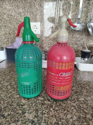 Se venden dos sifones antiguos, uno de la marca Ibersol y otro de Carbonicas Creus. Son ideales para coleccionistas o para dar un toque vintage a tu hogar. - Sifón Ibersol de color verde. - Sifón Carbonicas Creus de color rojo. - Fabricados en plástico. - Incluyen la boquilla dispensadora.